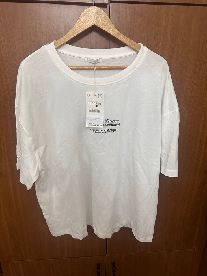 Pamuk kumaştan, kısa kollu, yuvarlak yaka ve bol kesim beyaz baskılı tişört. Günlük kullanıma uygun rahat sokak stili.