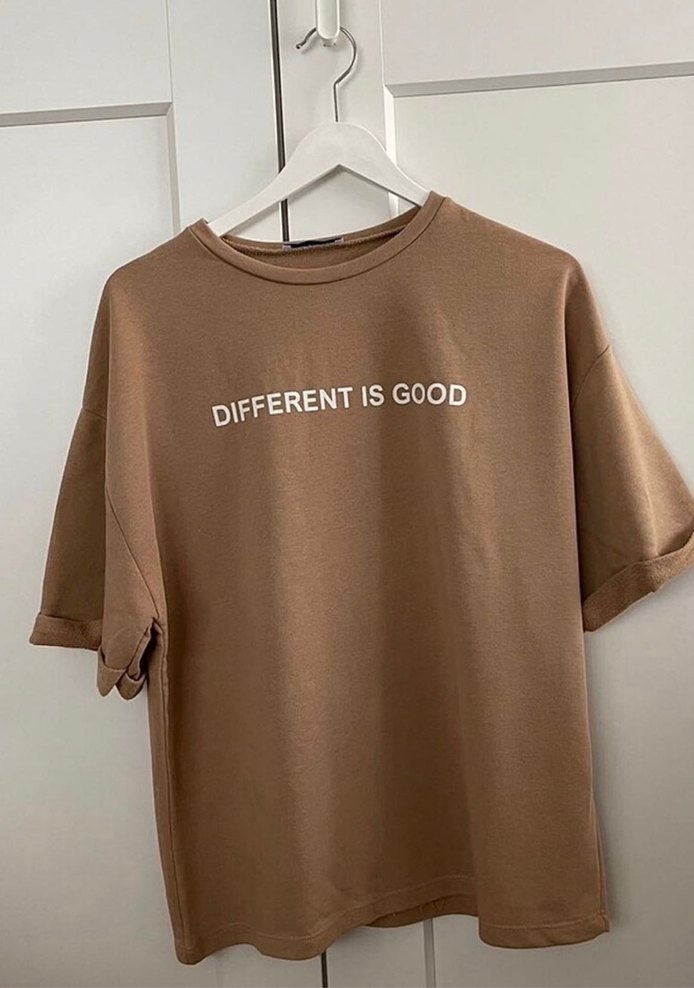 Kahverengi tişört, kısa kollu ve yuvarlak yaka.