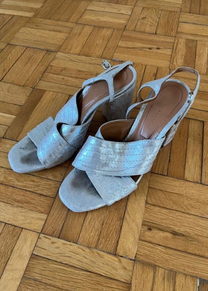 Uygulamadan satın aldım giyme fırsatım olmadı. İnce ayaklar için daha uygun olacağını düşünüyorum. Temiz ve az kullanılmış. Üst kısmı gümüş kumaşımsı nubuk gibi bir materyal. Abiyeler ile de kombinlenebilir. Kalın topuklu olması sebebiyle yürümesi rahat topuklu sandalet.