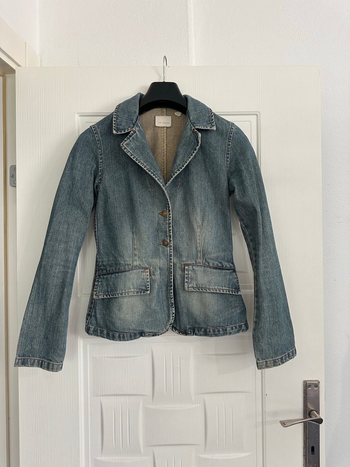 Gri denim kumaştan yapılmış, düğmeli ve uzun kollu, normal boyda, regular fit kadın ceket. Notched lapel yakaya sahip, günlük sokak stiline uygun.