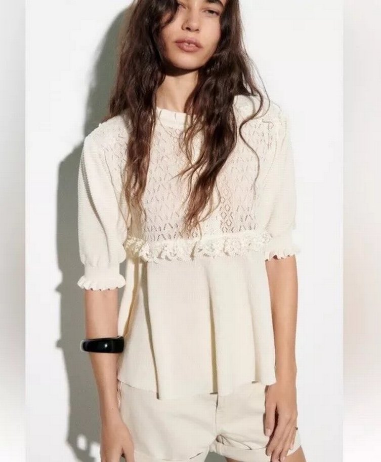 Dantel detaylı, kısa ve bol kesim beyaz tiriko bluz, yumuşak örgü kumaştan, yuvarlak yakalı ve kısa kollu, bohem tarzı yansıtıyor.