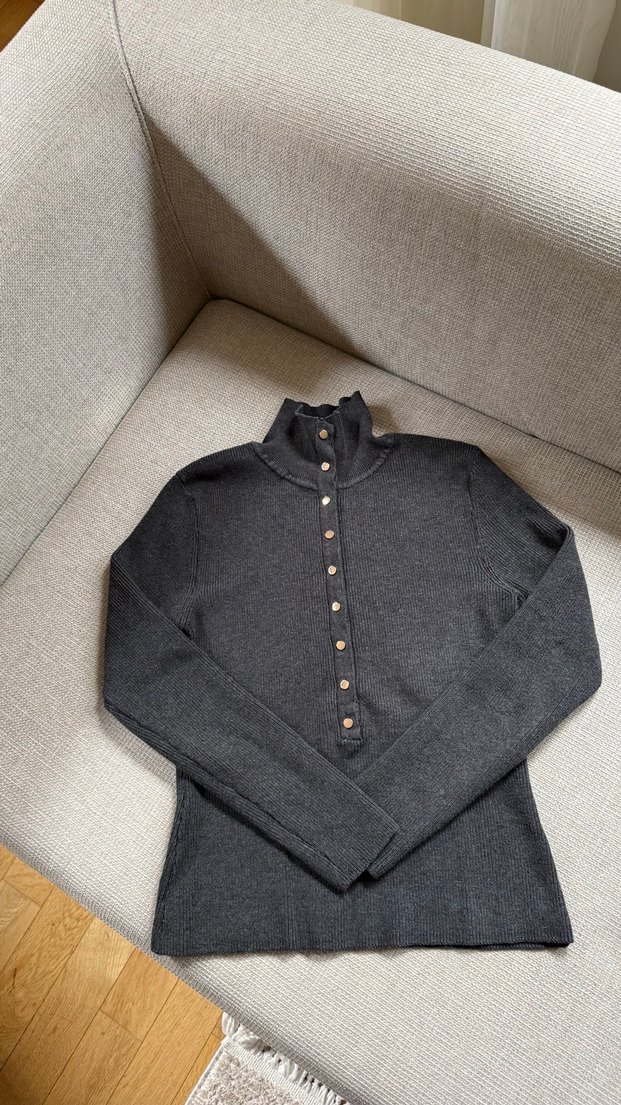 Düğmeli ön kısmı ve yüksek yakası olan, gri renkte, yün kumaştan yapılmış, vücuda oturan uzun kollu kazak. Günlük kullanım için uygundur. 1 defa giyildi sorunu yok