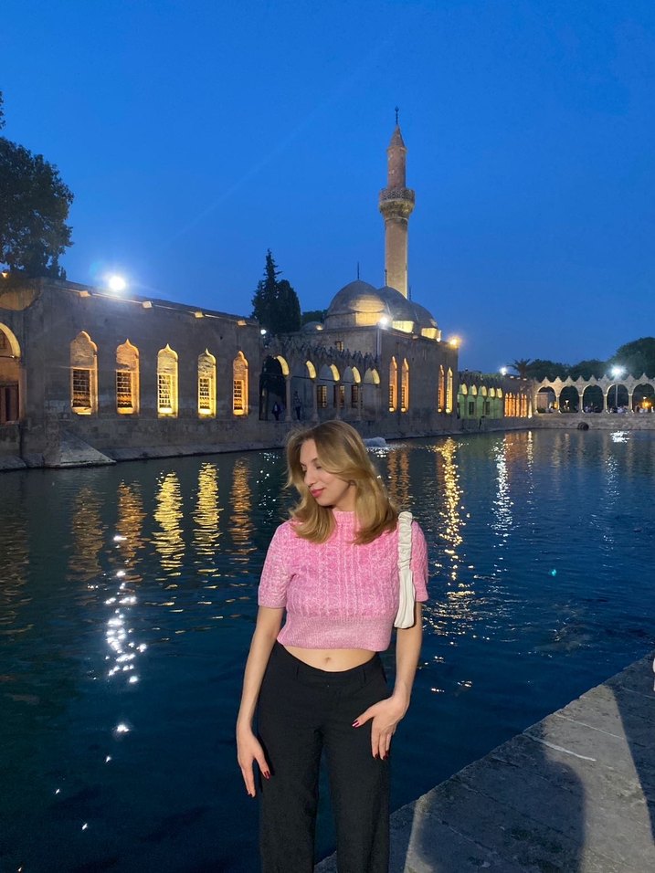 Pembe, pastel tonlarında, kısa kollu ve yüksek yakalı örgü triko kazak. Salaş kesimi ve batik desenleriyle romantik akşamlar için uygun.