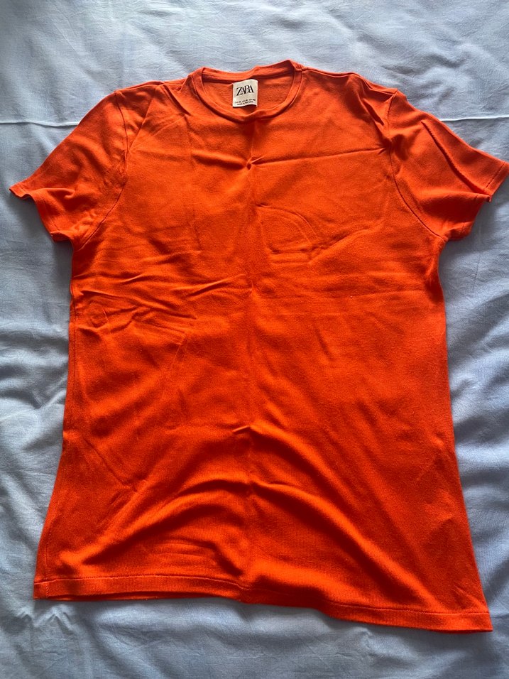 Zara Turuncu parlak renkte, Triko kumaştan yapılmış, kısa kollu, bisiklet yaka ve dar kesim erkek tişörtü. Minimalist ve basic tarzda, günlük kullanım için uygundur. Beden:M Genişlik:51cm Boy:66cm