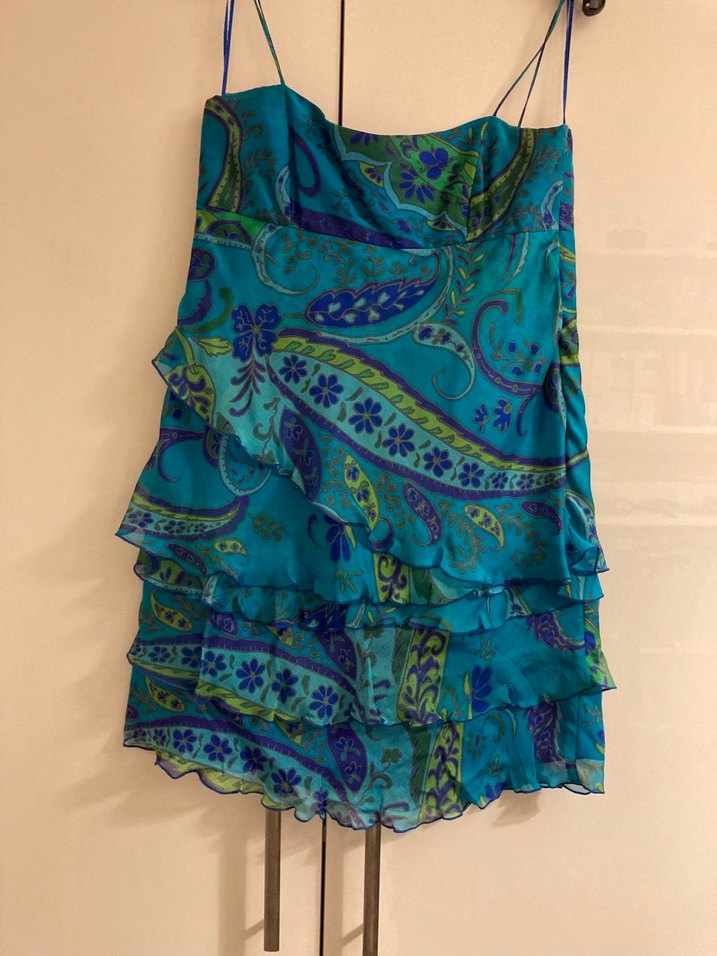 Bohem tarzda, vücuda oturan mini abiye elbise. Koyu turkuaz tie-dye desenli, kademeli fırfır detaylı, kolsuz ve parti için uygun. #abiye #mezuniyet #düğün #nişan #parti