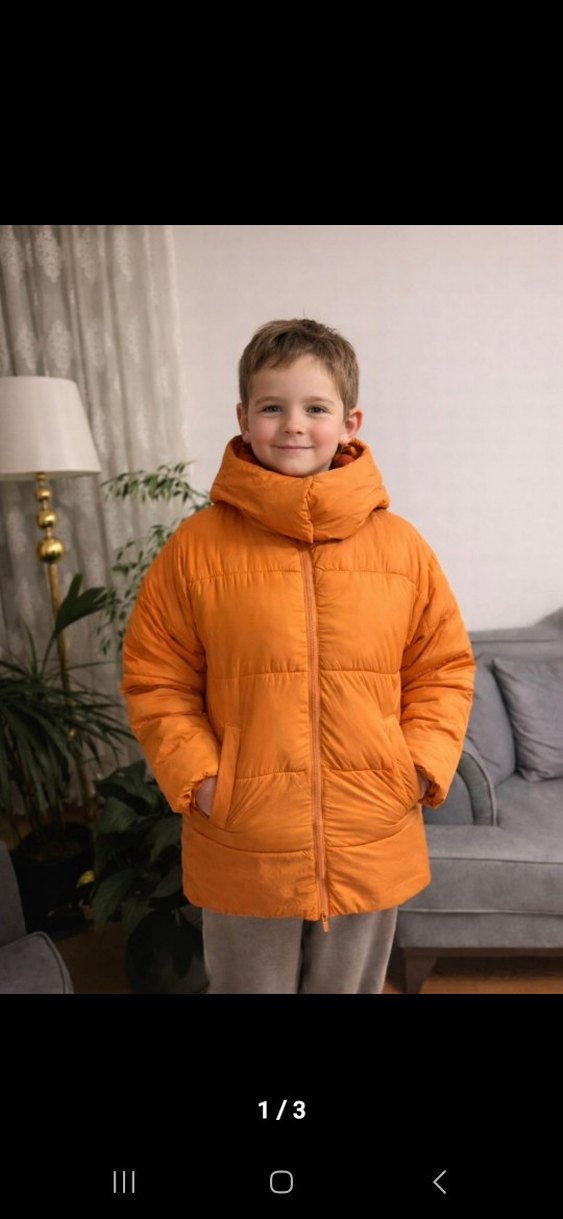 Turuncu renkli, şişme ve yüksek yakalı erkek çocuk montu, bol kesimi ve yumuşak, sıcak kumaşıyla günlük rahatlık sunar.