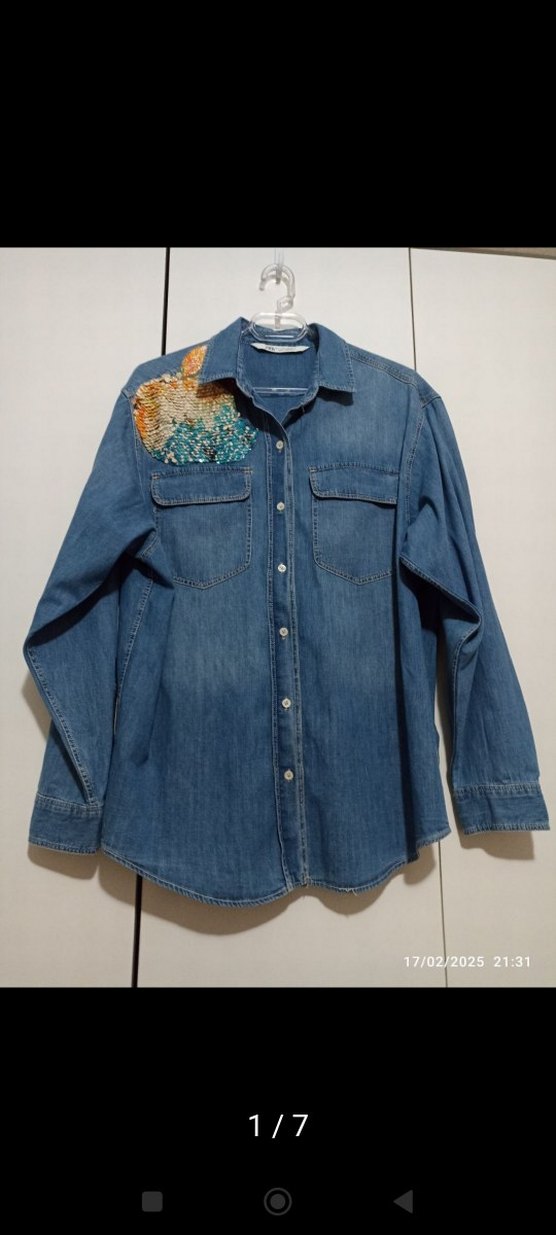 Düğmeli, nakışlı detaylı, uzun kollu, bol kesim mavi denim gömlek. Notlu yaka ve parlak mavi renkte, günlük kullanım için uygundur. orjinal zara etiketsiz sıfır ürün