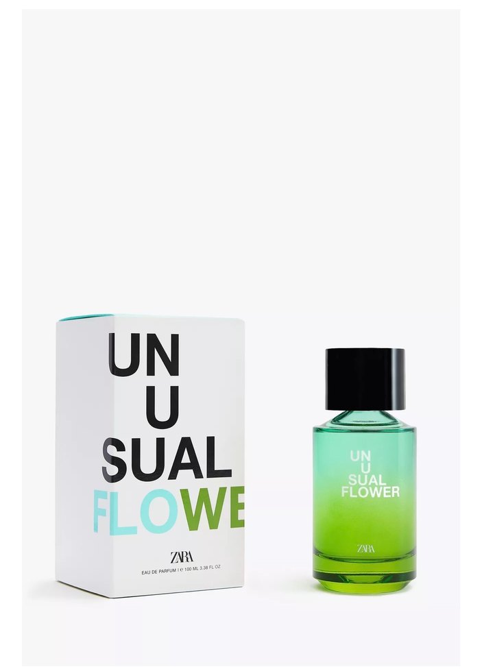 Zara Unusual Flower kadın parfümü, yeşil degrade şişede taze ve çiçeksi bir koku sunar. Siyah kapaklı ve kutusunda ürün ismi belirgin yazılıdır.