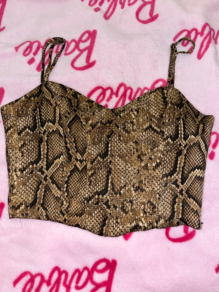 Deri yılan desenli, dantelli, askılı ve straplez yaka, vücuda oturan kahverengi büstiyer. Cesur sokak sitiline uygun korse detaylı SMALL beden
