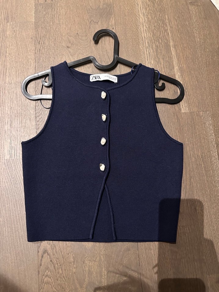 Düğmeli, kolsuz, lacivert kadın yelek. Yün kumaştan, kısa boy ve regular fit. Minimalist, günlük kullanıma uygun.