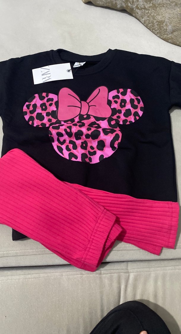 Uzun kollu, baskılı pembe fiyonk ve leopar desenli üst ile koyu pembe fitilli triko pantolonlu kız bebek takımı.