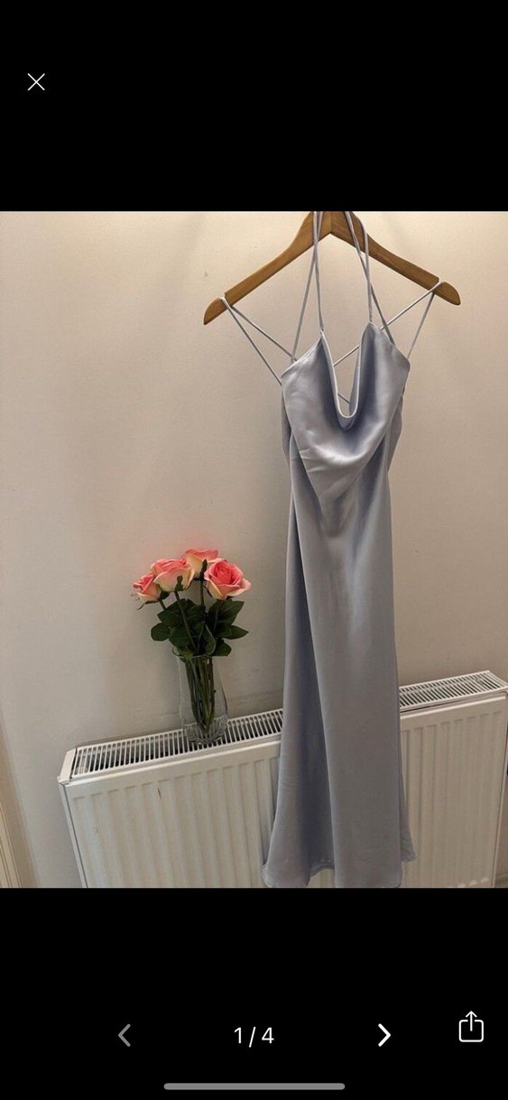 Gri - mavi renkte, drapeli ve ip askılı uzun, fitted kesim kadın elbisesi. Romantik akşamlar için uygundur. 1 kere kullandım