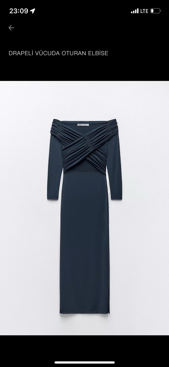 Uzun kollu, yandan yırtmaçlı, önü pencereli elbise. Petrol mavisi gibi bir rengi var. Drapesi çok şık duruyor. Yırtmacı yürürken açılmayacak şekilde. Herkesin cok begendiği bir elbiseydi. Kumaşı ince ama iç göstermiyor. S beden fakat yapışan bir model olduğu için XS bedene de uygun. Sadece 1 kere giyildi
