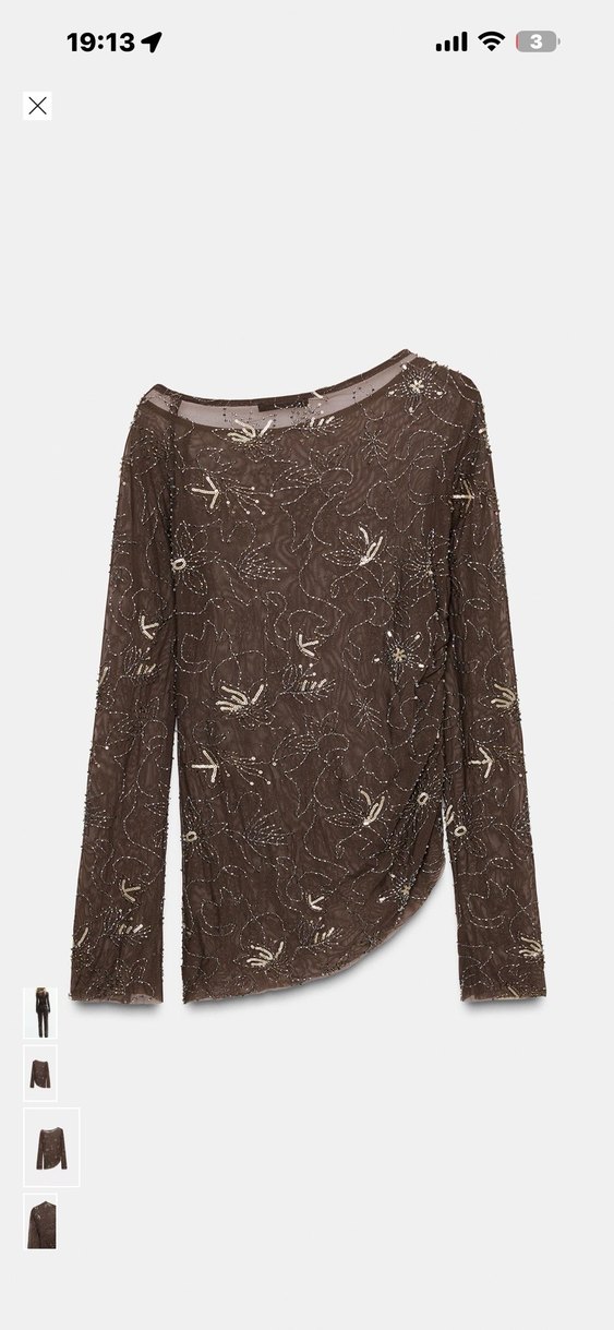 Zara Uzun Kollu Kahverengi Nakışlı Dantel Bluz