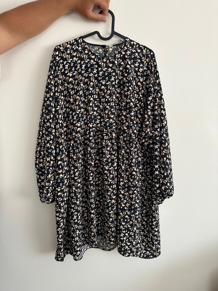 Uzun kollu, bol kesim mini elbise. Koyu renkli batik desen ve fırfır detaylarıyla trend bir günlük tarz. Tertemizdir.