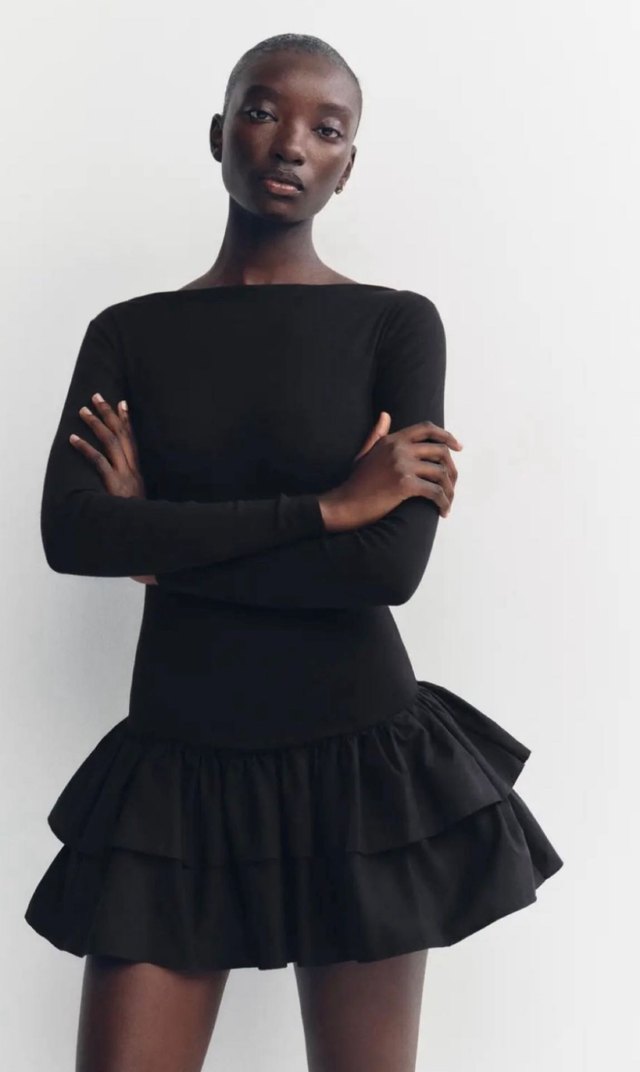 Zara Uzun Kollu Siyah Fırfırlı Midi Elbise