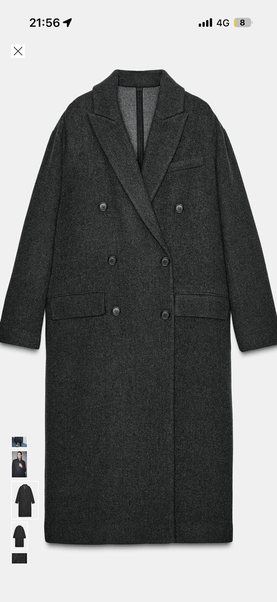 Antrasit renkli, çift düğmeli, uzun kaban. Yumuşak ve sıcak dokuda, yakalı ve kapaklı ceplidir.
