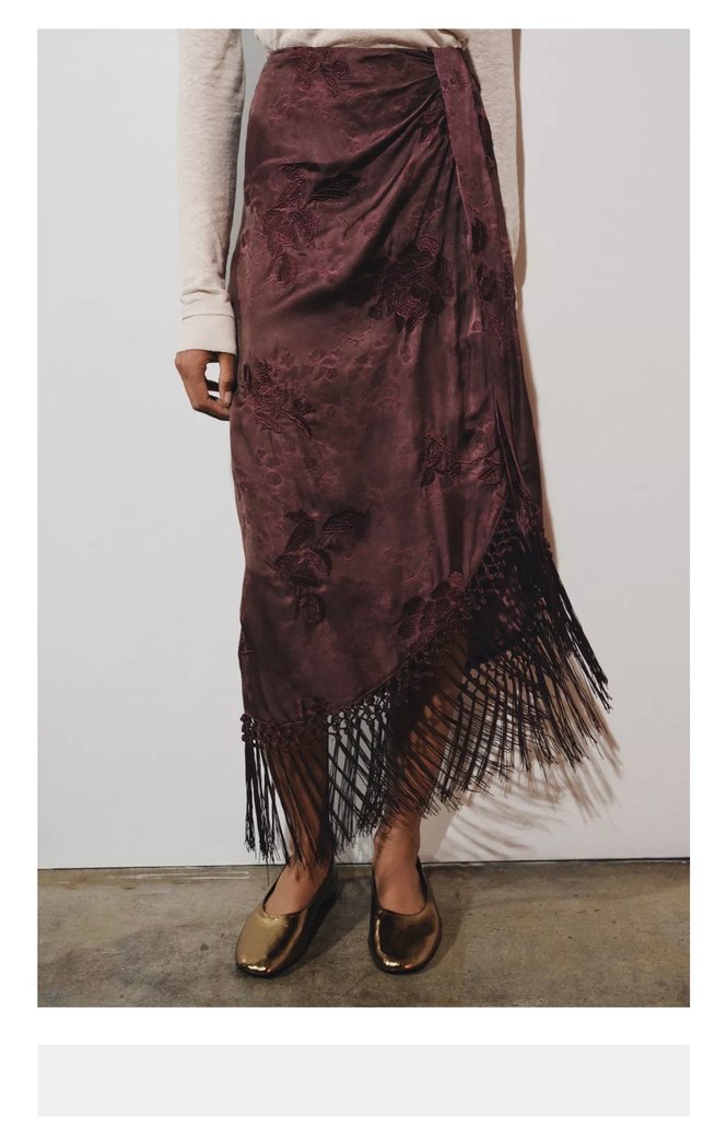 Bordo renkli, uzun, dökümlü ve bol kesim etek. İpek gibi yumuşak dokusu ve batik desenleriyle bohem tarzını yansıtır. Etek ucunda püsküller bulunur.