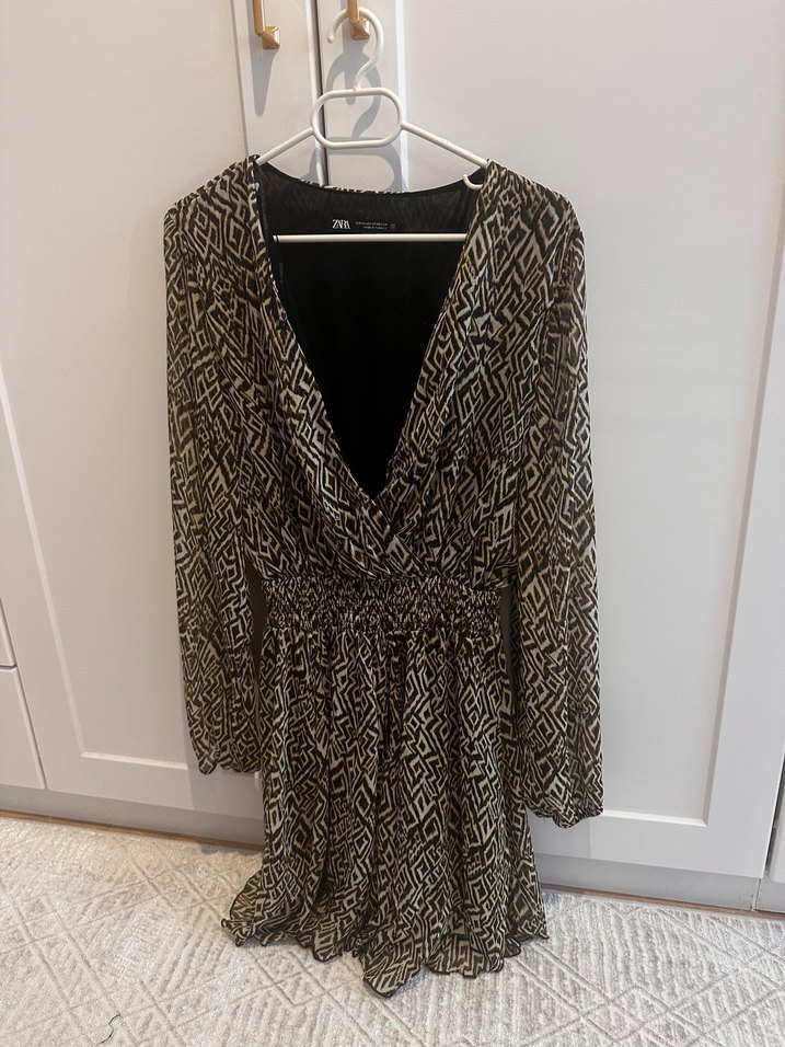 Bohem tarzda, koyu kahverengi yılan desenli, V yakalı, uzun kollu, drapeli ve bol kesim mini elbise.