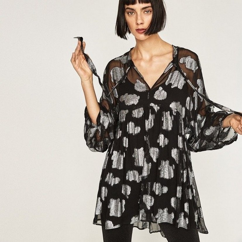 Bu bol kesim tunik, V yakalı ve uzun kolludur. Transparan, ipeksi kumaştan olup siyah ve metalik çiçek desenlidir. Avant-garde gotik tarzı yansıtır, romantik akşamlar için uygundur.