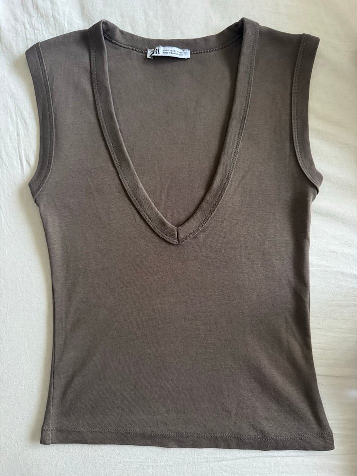 Kahve tonunda zara kolsuz V yakalı bluz. Günlük kullanıma uygun.