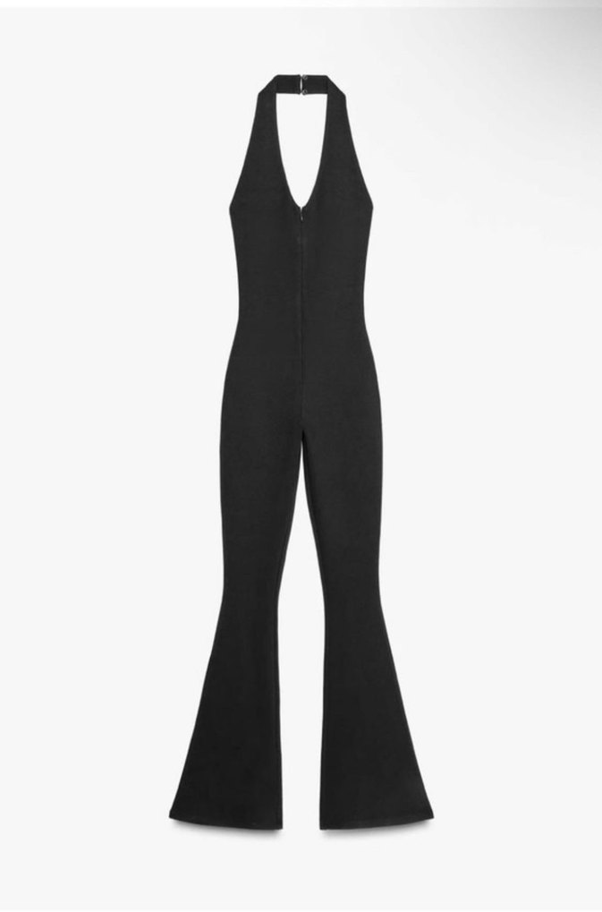 V yakalı ve askılı kollu, siyah ve ince dokuma sentetik kumaştan yapılmış, regular kesim uzun tulum. Esnek kumaştır.