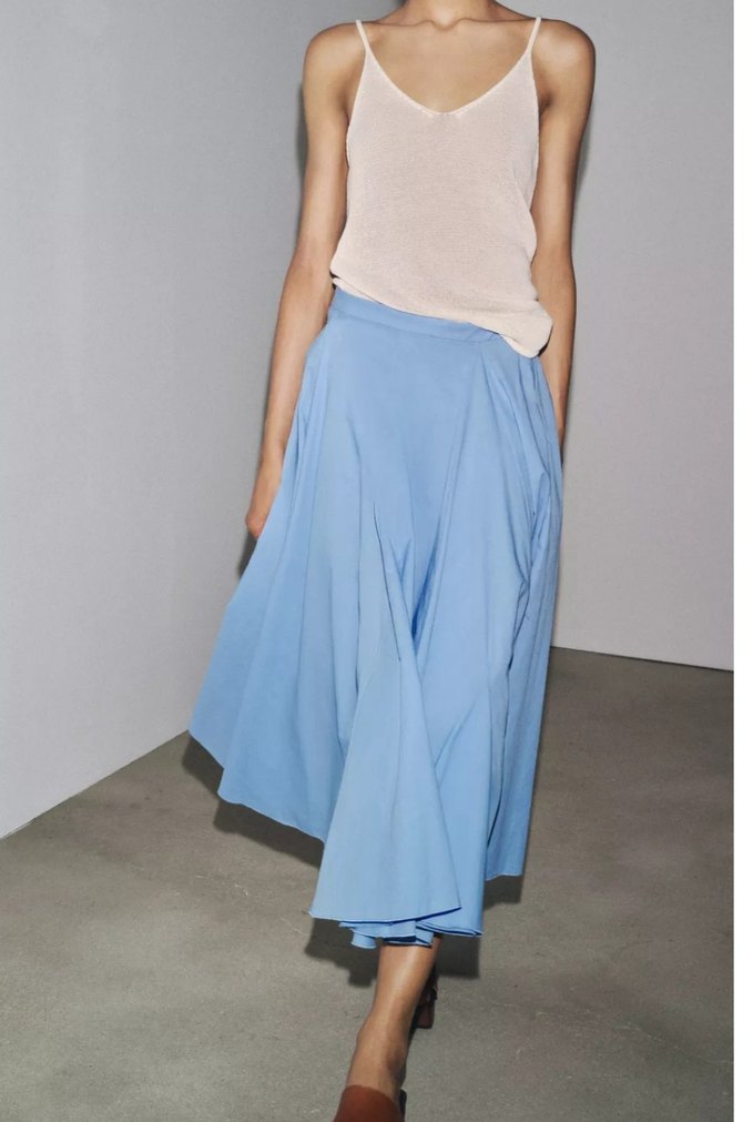 Pastel mavi renkte, pamuklu kumaştan yapılmış, salaş kesim ve drapeli detaylara sahip midi etek Minimalist ve normcore tarzıyla günlük kullanıma uygun.