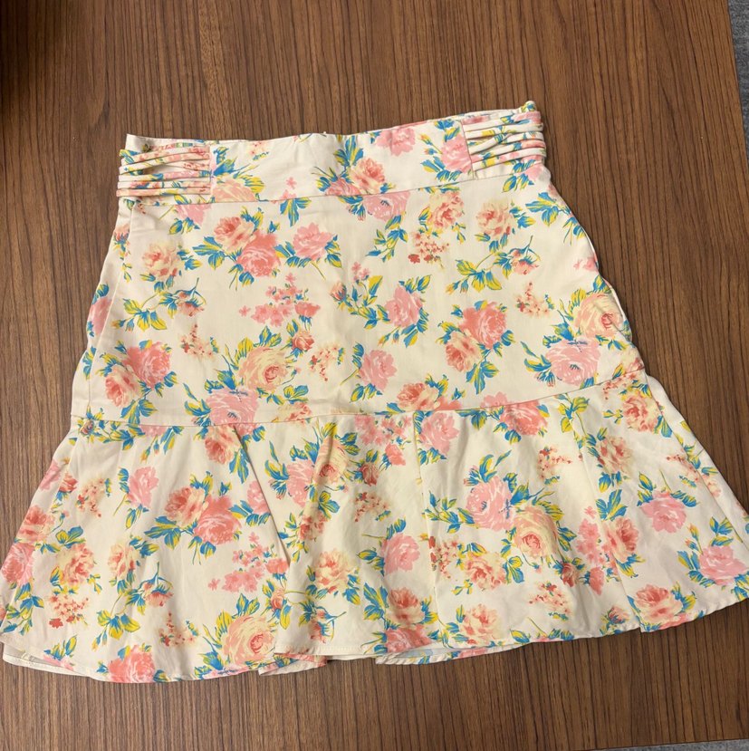 Bej renkte, yumuşak kumaştan yapılmış, çiçek desenli ve volan detaylı bol kesim mini etek. Ürün hiç kullanılmamıştır.