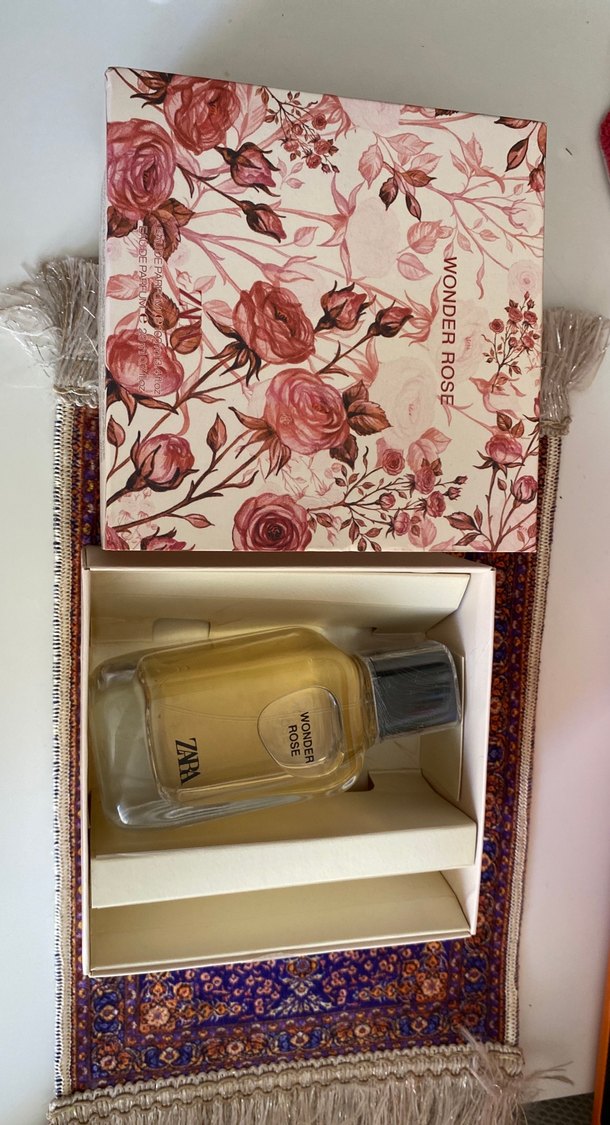 Zara Wonder Rose, şeffaf şişede ve gümüş kapaklı, çiçek desenli kutuda kadın parfümüdür.