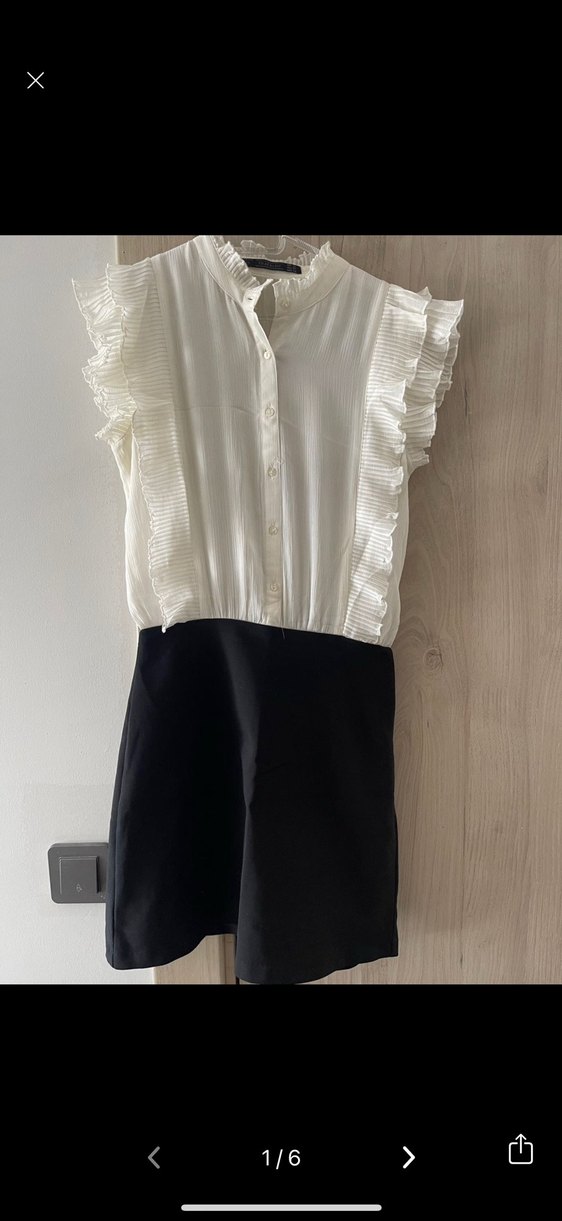 Yüksek yakalı ve kolsuz, fırfır detaylı kadın mini elbiseBeyaz üst ve siyah alt kısmı, sentetik yumuşak kumaştan. Ofis ve günlük kullanım için uygundur. ✨