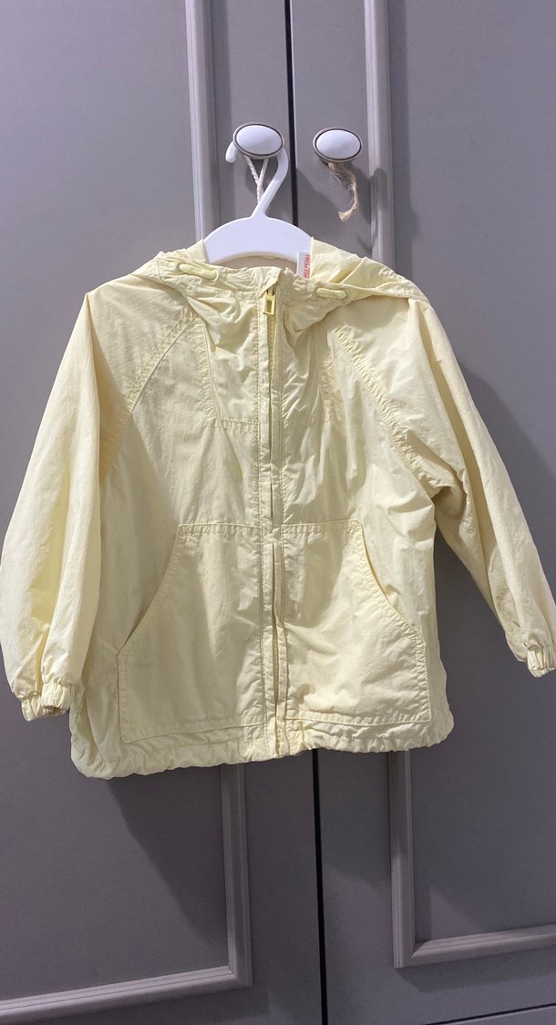 Açık sarı renkli erkek çocuk yağmurluğu, fermuarlı ve bol kesimdir. Keten kumaştan üretilmiş, yakası kesik ve manşetleri lastiklidir. Sokak stiline uygundur. ☔