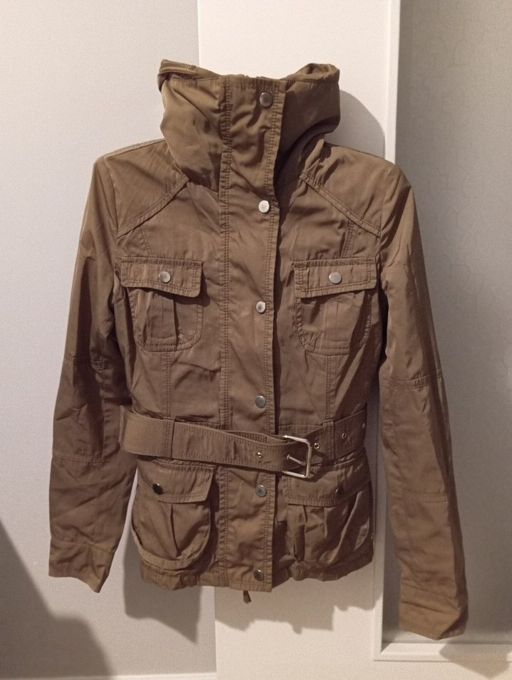 Bej renkli, kemerli ve dar kesim kadın ceket. Çıtçıtlı cepleri ve kesik yaka detayıyla sokak stiline uygun, dış mekan kullanımı için ideal.