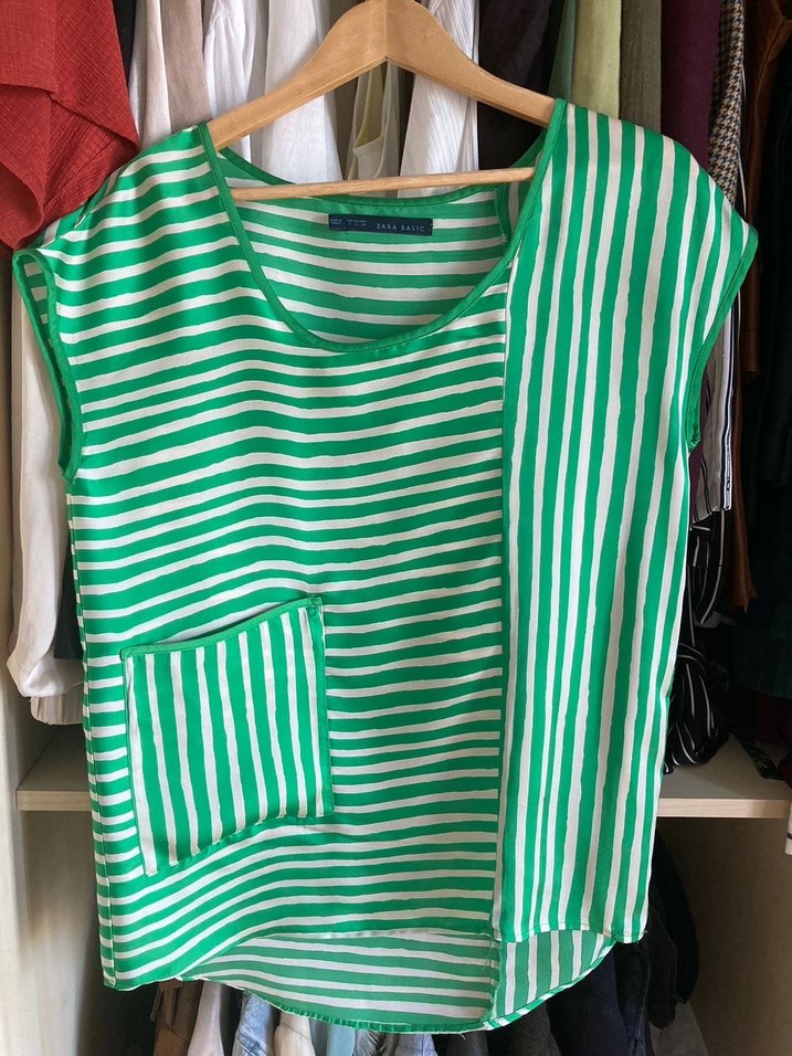 Yeşil beyaz parlak çizgili, salaş kesim ve drapeli hamile bluz. Kolsuz, yuvarlak yaka ve ön cep detayına sahip, günlük sokak stiline uygun. Birkaç kez giyildi. Kalıbı oversizedır