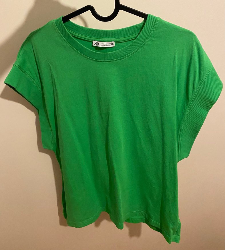 Yeşil renkli, kısa kollu kadın tişörtü, yuvarlak yaka ve bol kesime sahiptir. Keten kumaştan üretilmiş olup günlük kullanıma uygundur. Herhangi bir kusuru yoktur