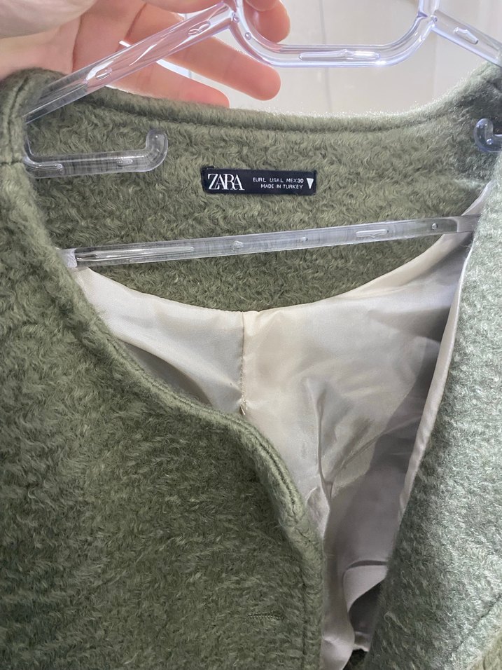 Zara marka, yeşil renkte, düğmeli ve V yaka kadın ceketi. Yumuşak sentetik kumaştan, bol kesim ve midi boy, uzun kolludur. Günlük sokak stili için uygundur.