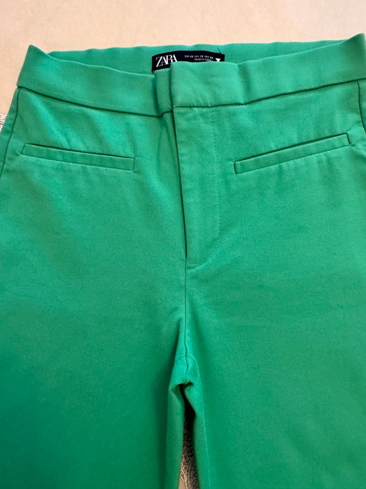 Zara marka, fermuarlı, parlak yeşil midi uzunlukta, düz ve desen içermeyen, normal kesim kadın kumaş pantolon. Ofis kullanımı için uygun.