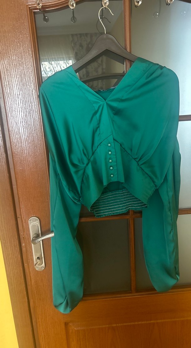 Yeşil parlak kumaştan, V yakalı, uzun kollu, düğmeli ve midi boyda bol kesim bluz. Şık ve farklı bir tarz sunar. normalde s giyiyorum bol dökümlü duruyor s-m-l olur