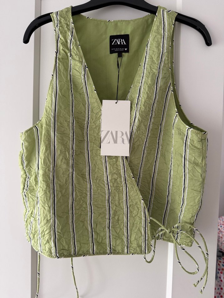 Zara'nın yeşil parlak çizgili kumaştan, nakışlı çizgiler ve pilili detaylara sahip kolsuz yeleği. V yaka ve normal kesim, midi boyda, yan bağcıklı.Ürün sıfır ve etiketlidir.Melodi yazın takımını giymişti inanılmaz hoş duran bir yelek.