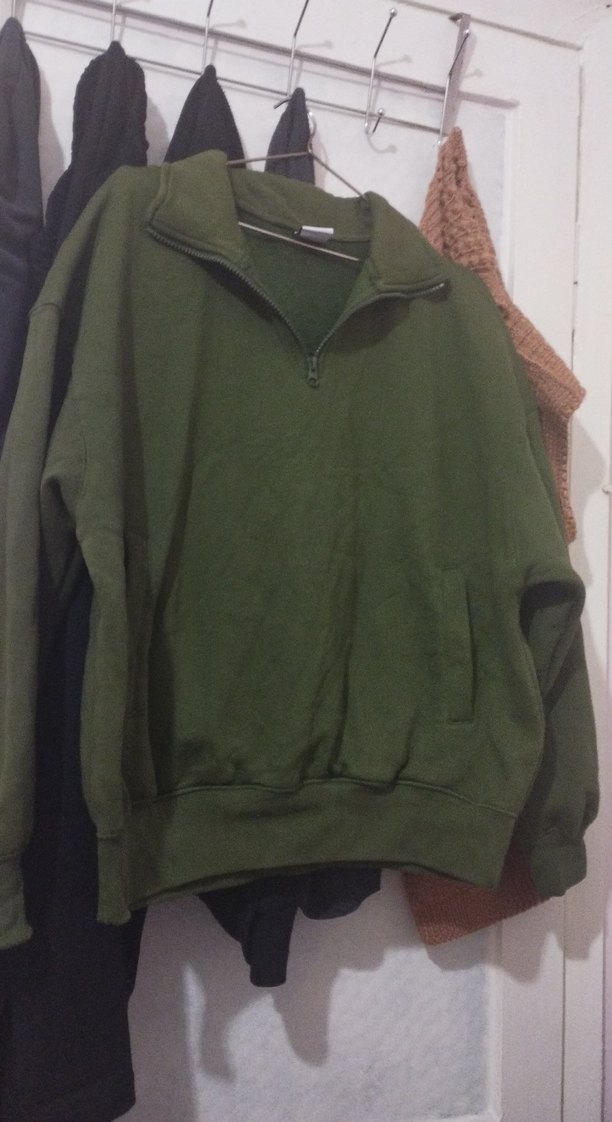 Yarım fermuarlı, yüksek yakalı, uzun kollu yeşil erkek sweatshirt. Rahat kesimi ve yumuşak, sıcak kumaşıyla günlük kullanıma uygundur.