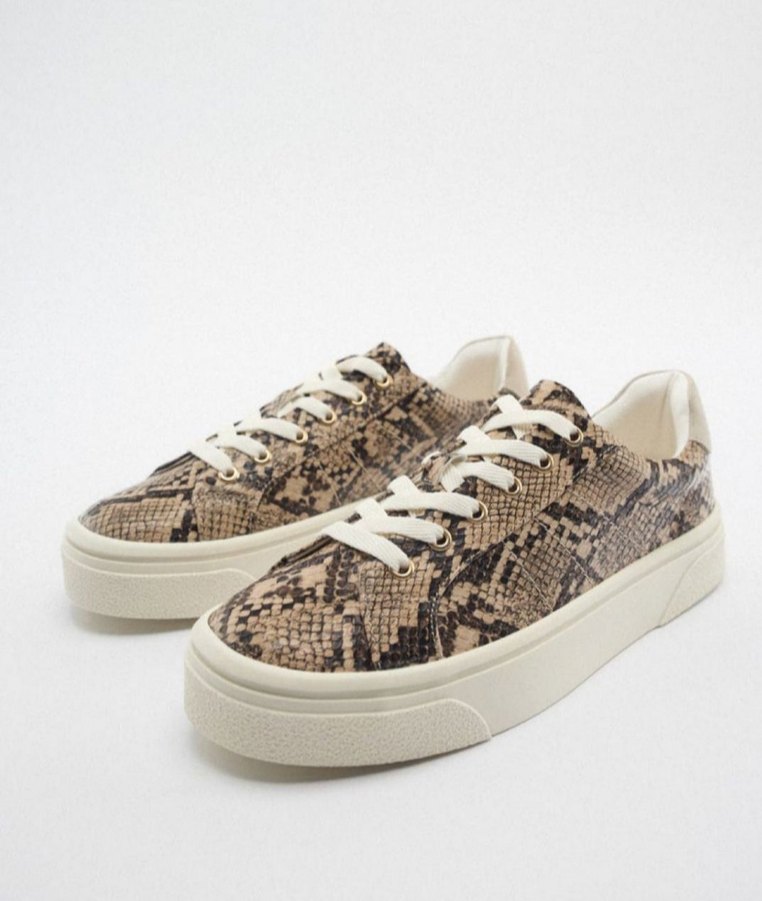 Kadınlar için açık kahverengi yılan desenli, bağcıklı ve platform tabanlı kauçuk spor ayakkabılar. Günlük kullanıma uygun, rahat ve trend görünümlü