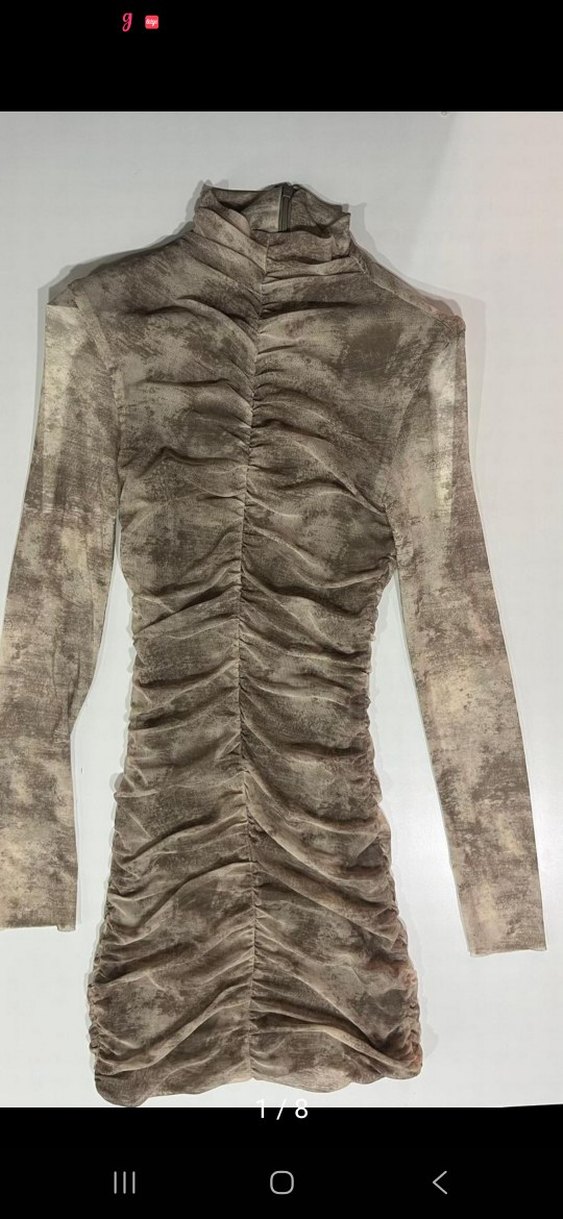 Sıfır.7/24 Sürat Kargo ♂️Dar kesim, yüksek yakalı, uzun kollu triko elbise. Bej ve gri yılan desenli, drapeli, uzun boyda, çağdaş tarzda.