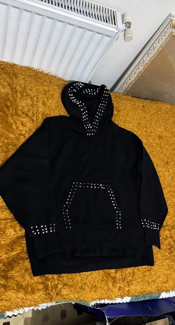 Zara Kapüşonlu, zımba işlemeli siyah sweatshirt. Yumuşak ve sıcak kumaştan, bol kesim ve uzun kollu, rahat kullanım için ideal.