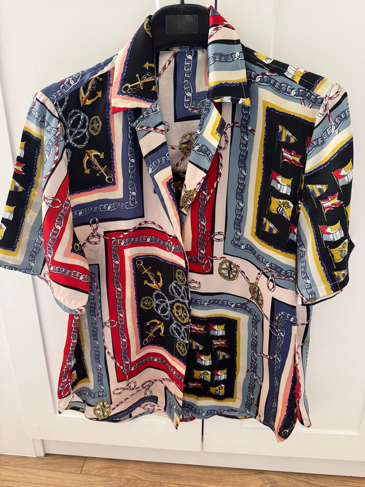 Zincir detaylı, kısa kollu, desenli ve gömlek yaka temiz kullanılmış gömlektir.