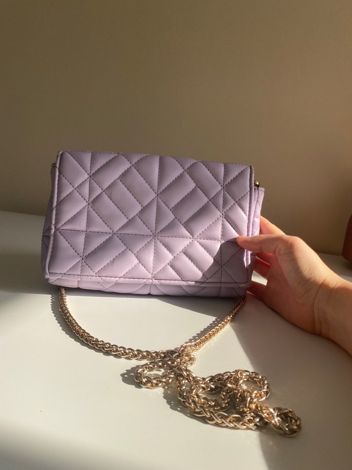 Pastel lila renkli, zincir askılı ve kapitone desenli kadın çantası. Düz sentetik kumaştan üretilmiş, minimalist tarzda günlük kullanıma uygun.