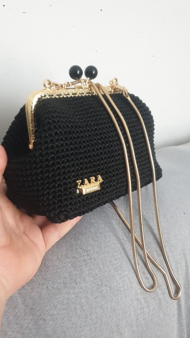 Zara'nın siyah örgü kadın çantası, zincir detayları ve işlemeli deseniyle klasik zarafeti modern tarzla buluşturuyor. Günlük kullanıma uygun. kendi el emegim .