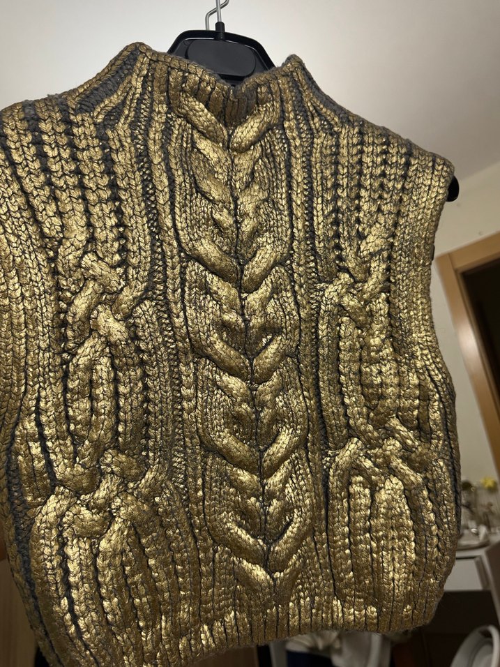 Parlak altın iplikle örülmüş, boğazlı ve kolsuz, vücuda oturan bohem tarzda örgü süveter. Günlük kullanıma uygundur. ✨