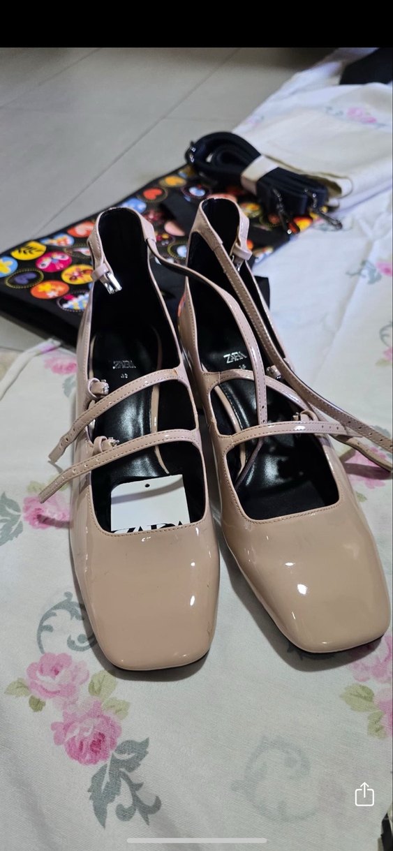 Orijinal Zara yurtdışından alındı. Bej rugan stiletto topuklu, tokalı ve baskılı detaylara sahip, pastel tonlarda kadın ayakkabısı. Sokak modasına uygun, günlük kullanım için ideal.