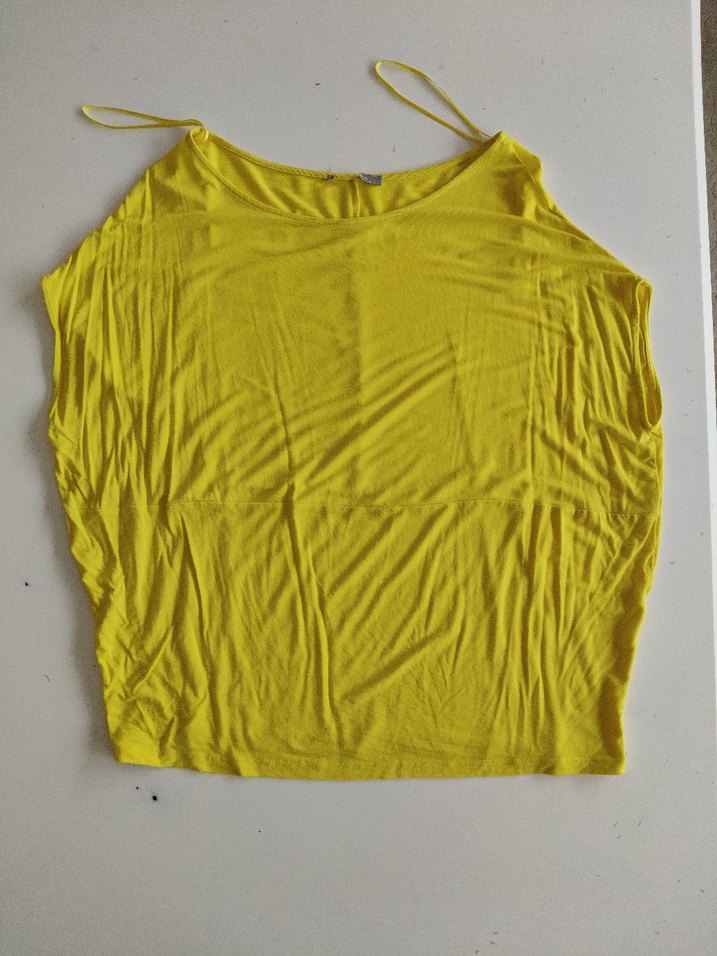 Sarı renk, kolsuz, salaş kesim kadın bluz. Tek renk ve parlak görünümlü, sade ve minimal stil ile günlük kullanıma uygun.