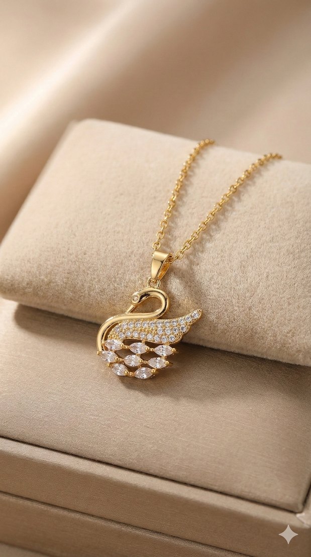 Altın renkli, kısa zincirli ve parlak taşlarla süslenmiş kuğu figürlü kolye. Modern klasik tarzda, günlük şıklık için ideal.