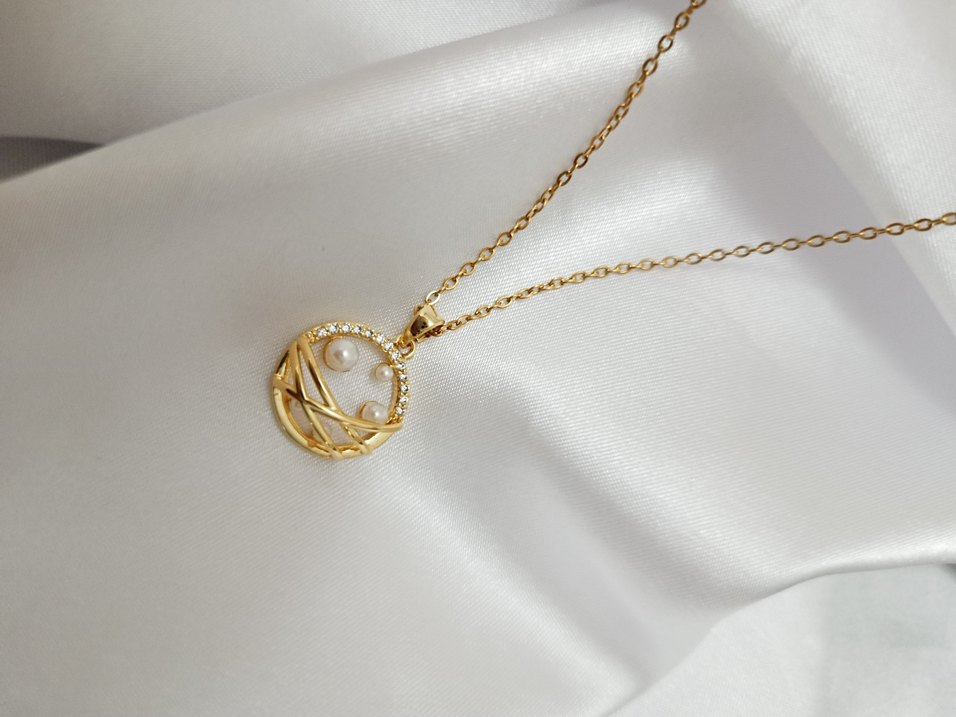 Altın renkli, detaylı zincir ve inci detaylı, işlemeli yuvarlak kolye ucu ile günlük kullanıma uygun kolye. ✨